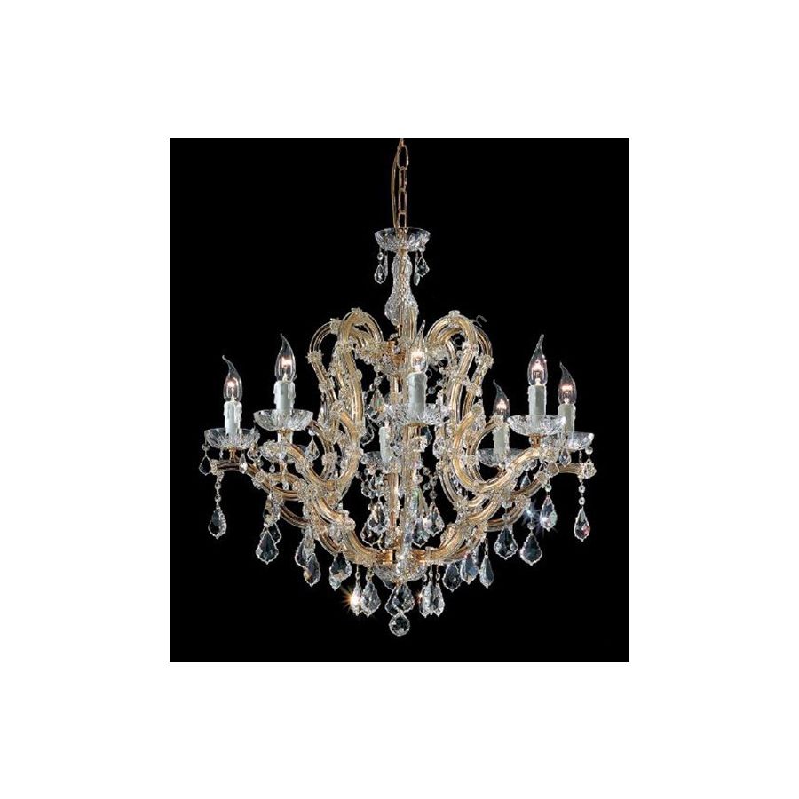 Mariateresa chandelier with Gold plated metal frame covered by transparent glass arms and transparent Crystal pendants. Lighting item that diffuses the light with great effect in the surrounding environement creating a warm and welcoming atmosphere.