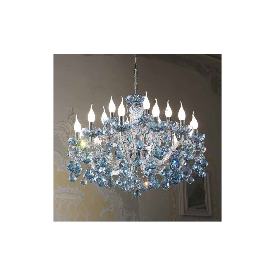 Chromed mettal frame covered with transparent glass strips and sapphire Crystal pendants. Lighting item that diffuses the light with great effect in the surrounding environement creating a warm and welcoming atmosphere.