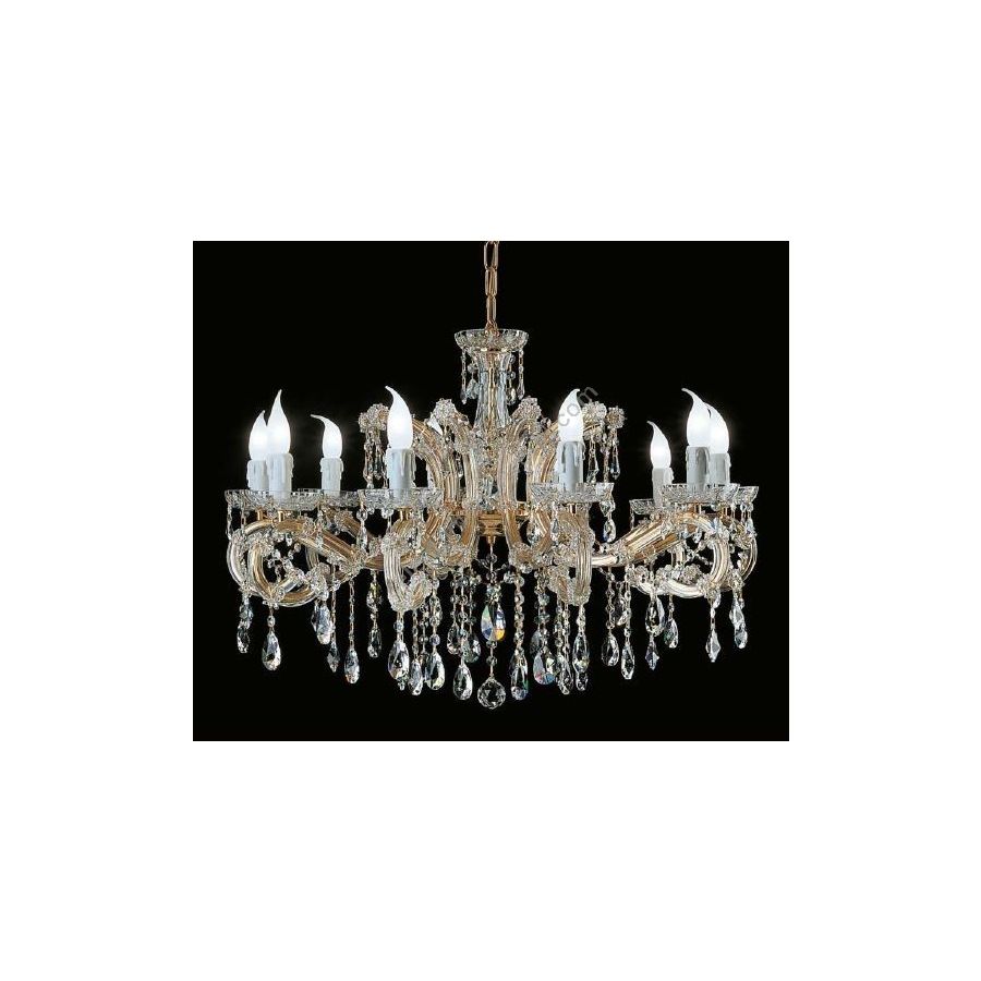 Mariateresa Chandelier with Gold plated metal frame covered by transparent glass arms and transparent Crystal pendants. Lighting item that diffuses the light with great effect in the surrounding environement creating a warm and welcoming atmosphere.