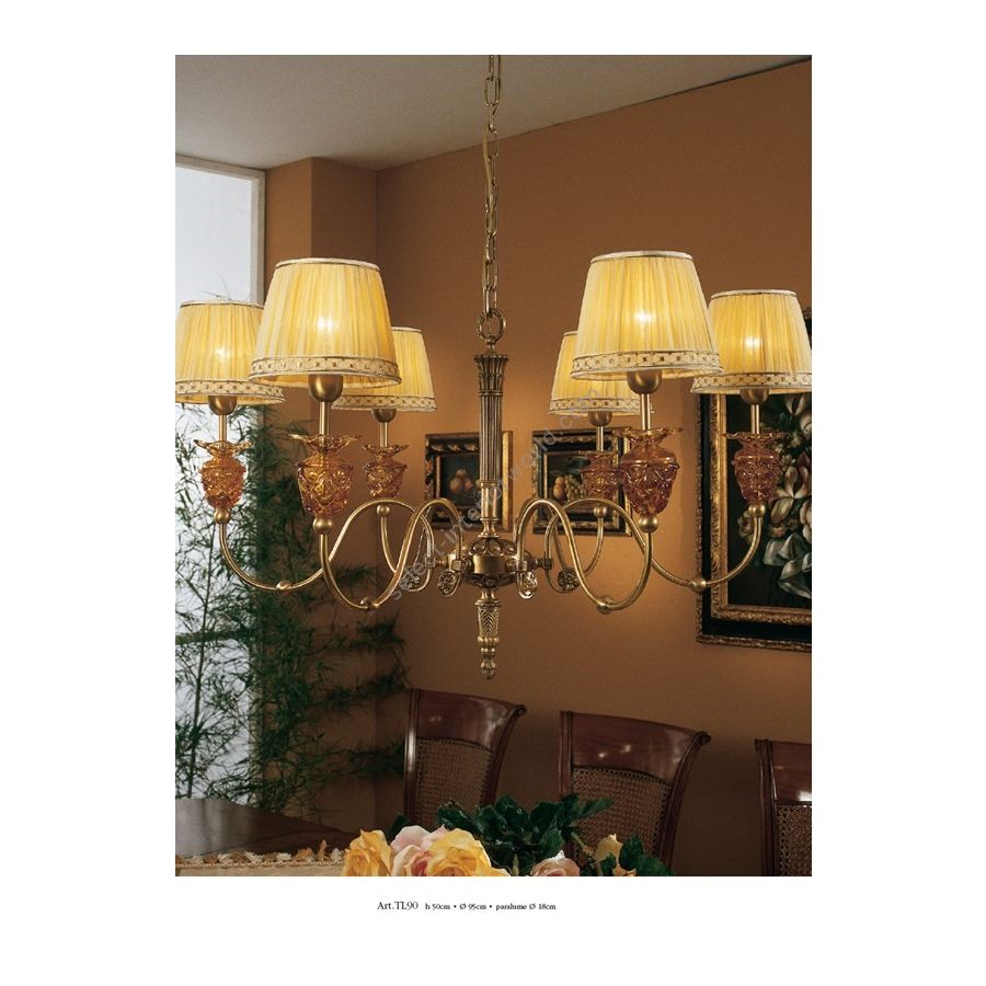 Chandelier 6 lights with amber glass decorations and fabric lampshades. Lighting item that diffuses the light with great effect in the surrounding environement creating a warm and welcoming atmosphere.