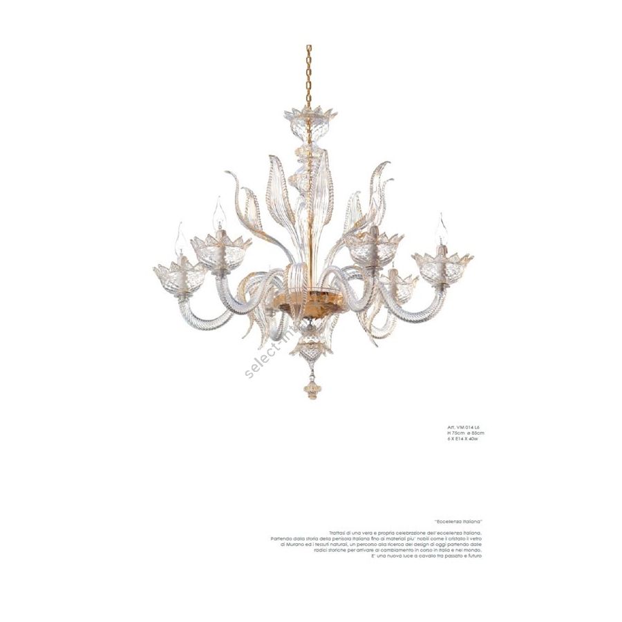 6 lights transparent and golden chandelier. Lighting fixture that diffuses the light into the surrounding environment with great effect, creating a warm and welcoming atmosphere.