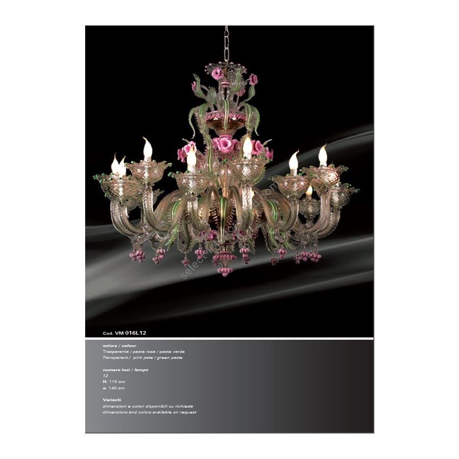 12 lights transparent chandelier with pink and green paste. Lighting fixture that diffuses the light into the surrounding environment with great effect, creating a warm and welcoming atmosphere.