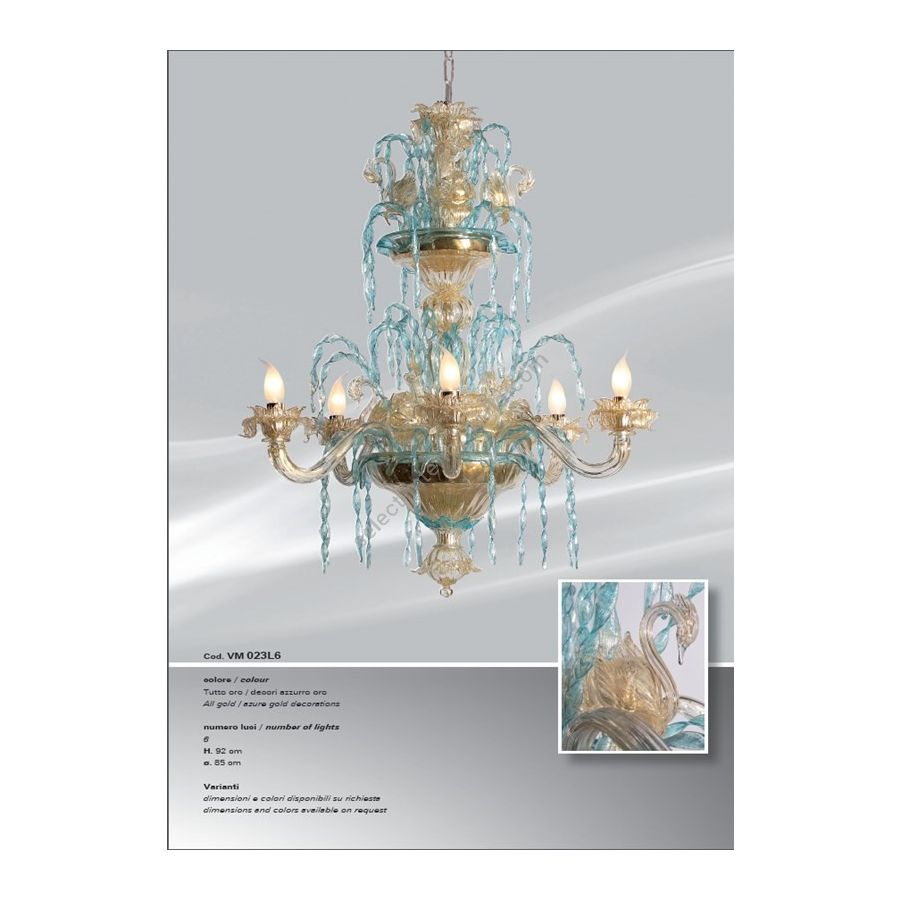 Golden chandelier with 6 lights with blue-gold decorations. Lighting fixture that diffuses the light into the surrounding environment with great effect, creating a warm and welcoming atmosphere.