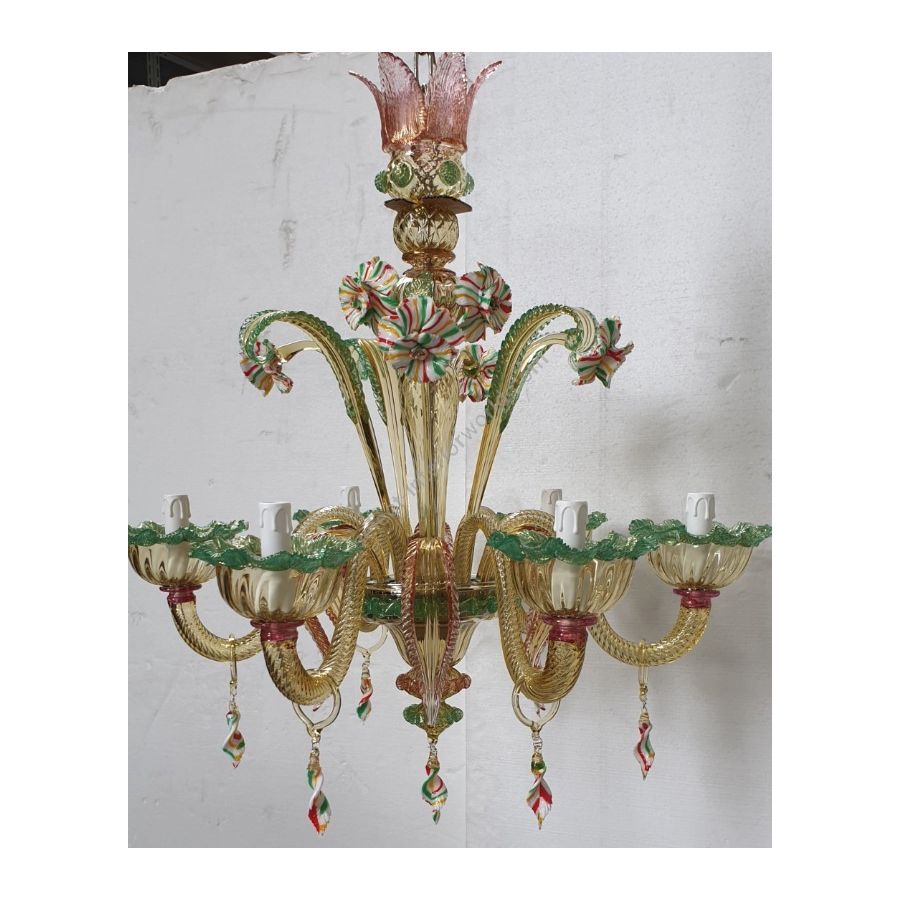6-light amber chandelier with flowers in pasa and decorations in green, ruby and gold. Lighting fixture that diffuses the light into the surrounding environment with great effect, creating a warm and welcoming atmosphere.