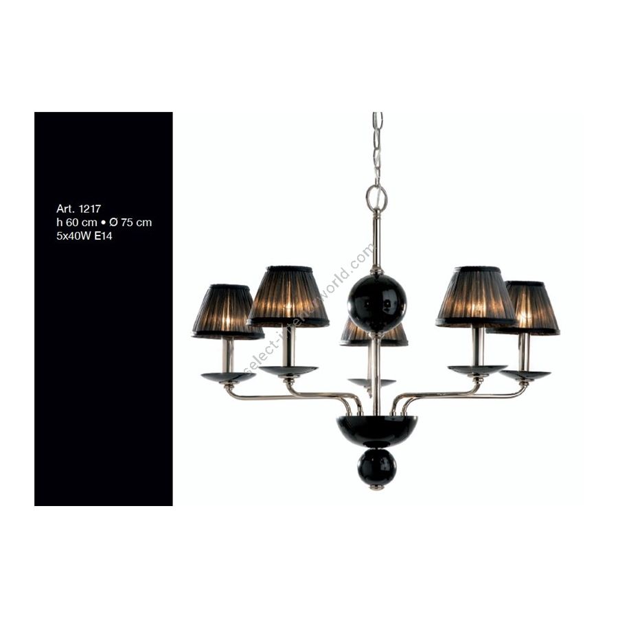 5 lights chandelier with black Murano glass elements, conical lampshades. Lighting fixture that diffuses the light into the surrounding environment with great effect, creating a warm and welcoming atmosphere.