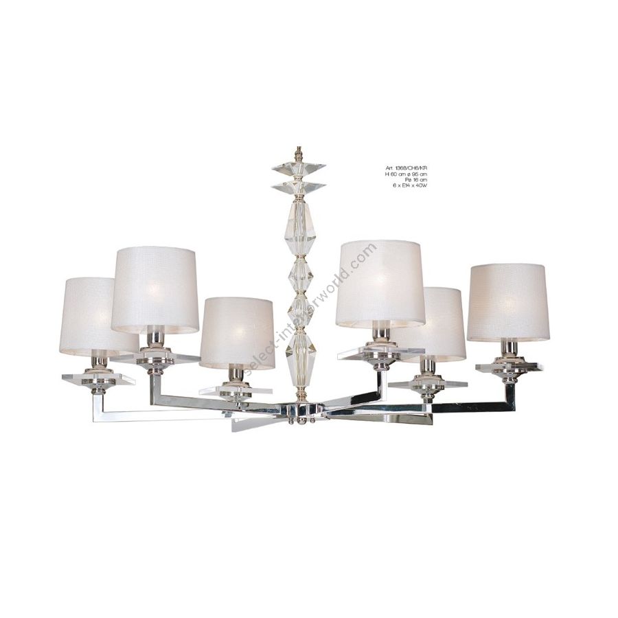 Chandelier with crystal inserts and fabric lampshades. Lighting item that diffuses the light with great effect in the surrounding environement creating a warm and welcoming atmosphere.