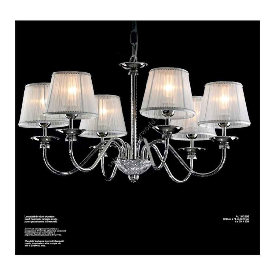 Chandelier with Swarovski® inserts, lampshade in white crumple silk with a Swarovski® braid. Lighting item that diffuses the light with great effect in the surrounding environement creating a warm and welcoming atmosphere.