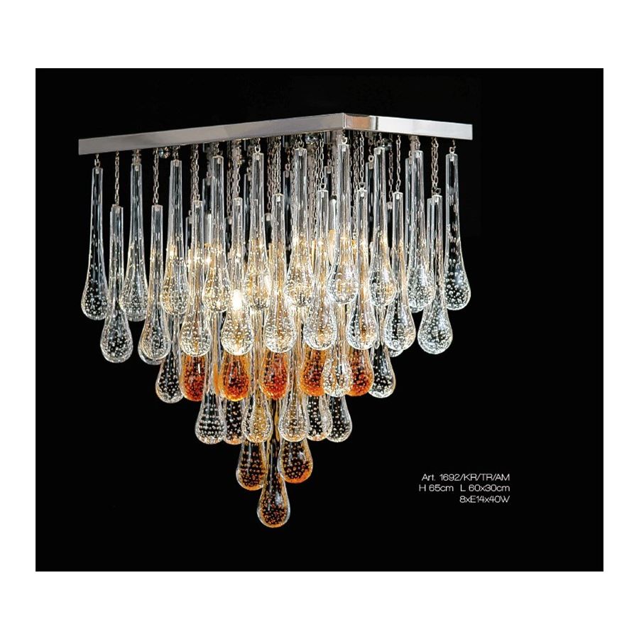 Chandelier with Murano Glass drops clear and amber. Lighting item that diffuses the light with great effect in the surrounding environement creating a warm and welcoming atmosphere.