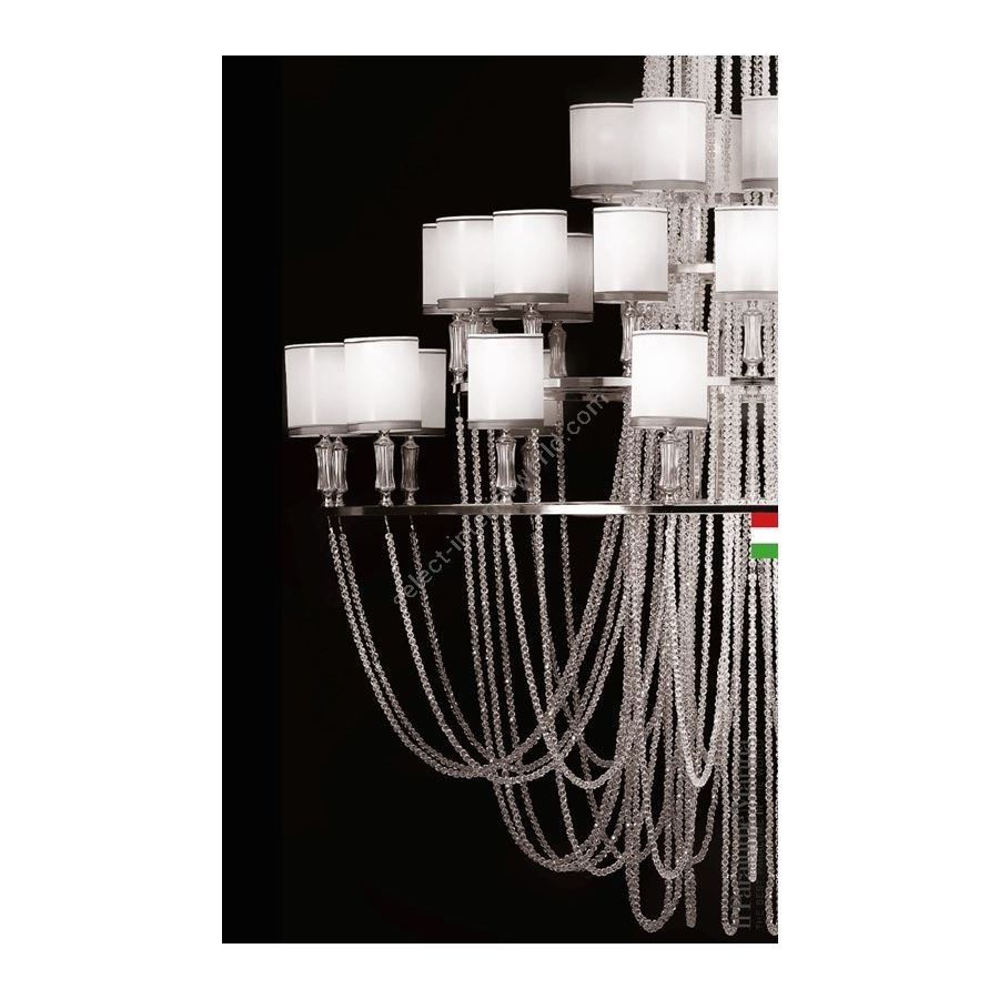 Chandelier 40 lights, brass circles with rows of crystal pearls. Lampshades in white shiny organza on pvc with silver thread trimming. Lighting item that diffuses the light with great effect in the surrounding environement creating a warm and welcoming atmosphere.