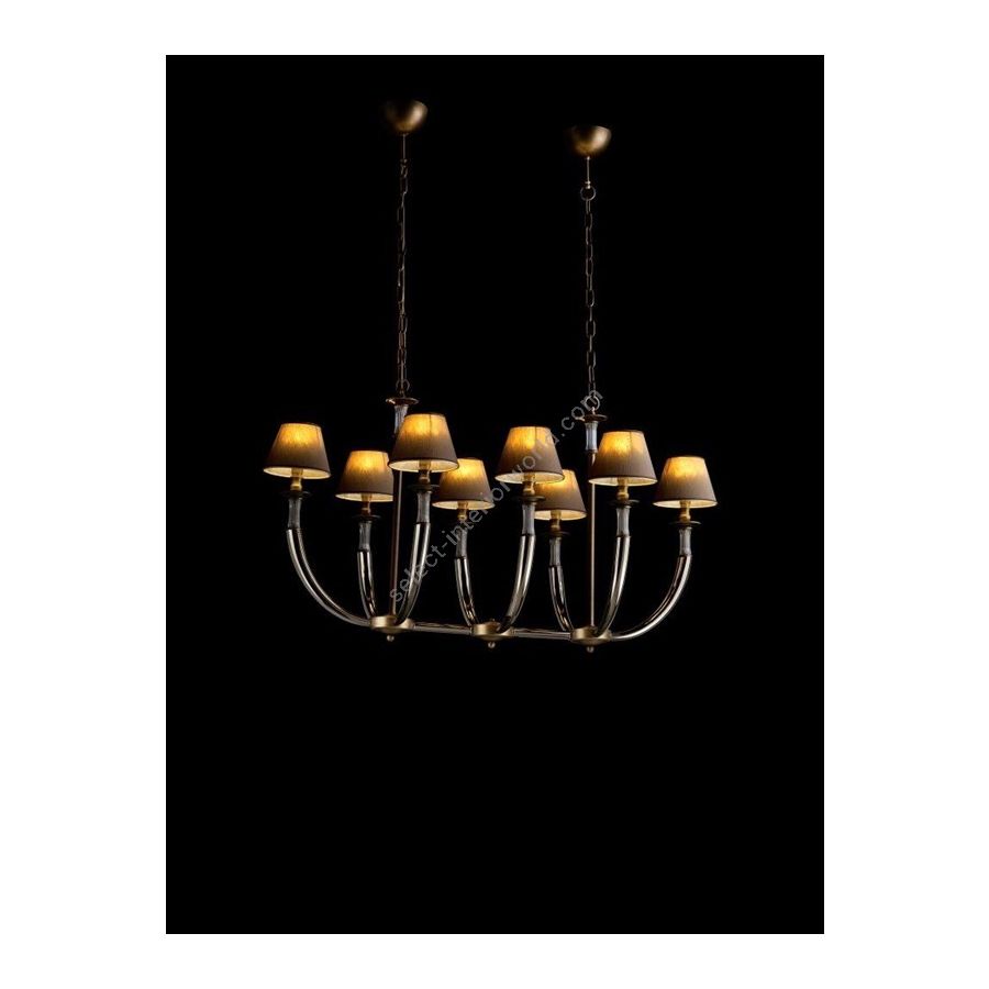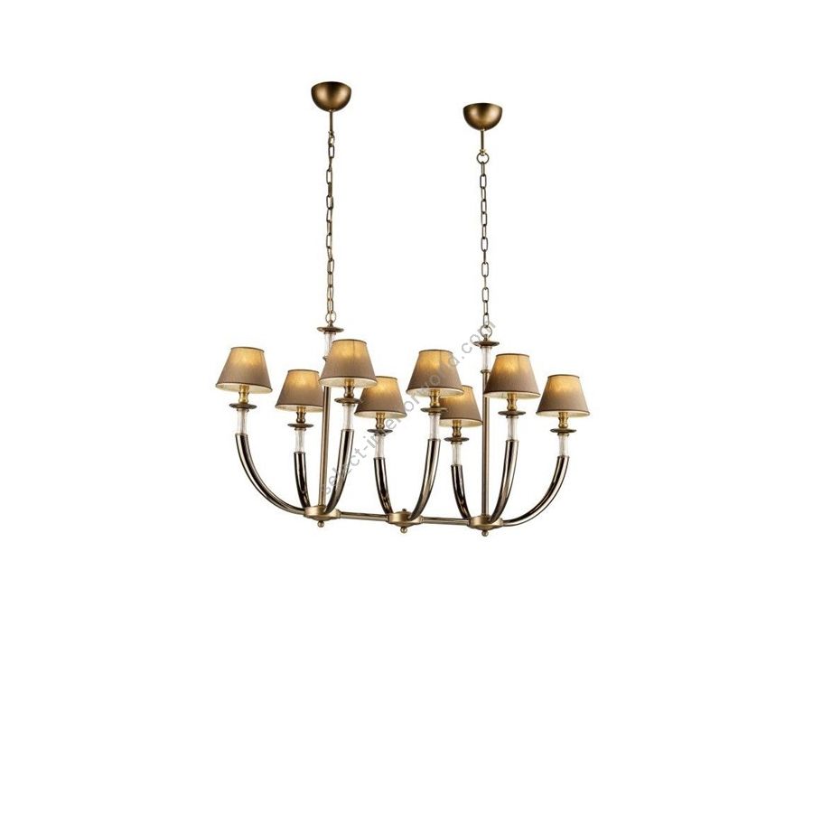 Chandelier 8 lights oval in brass with hand-made lampshades. Lighting item that diffuses the light with great effect in the surrounding environement creating a warm and welcoming atmosphere.