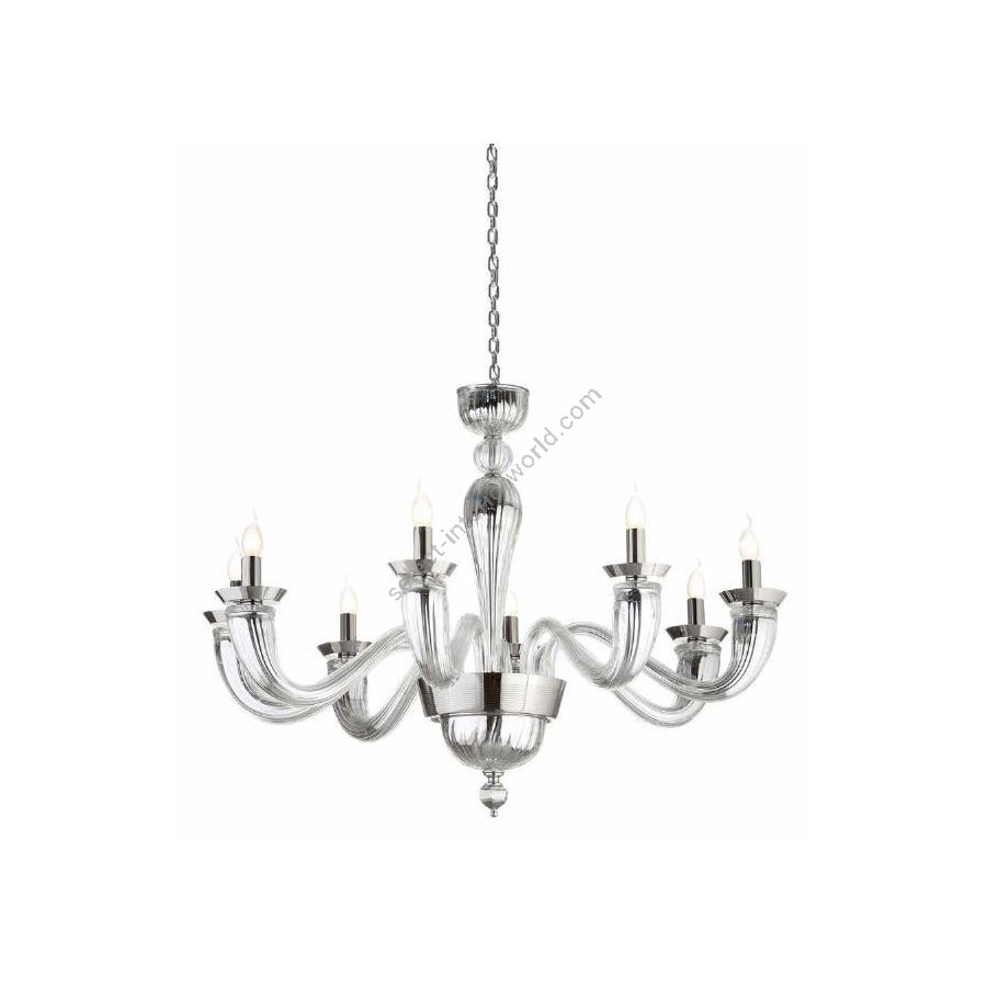 8 lights Chandelier in Murano glass with mirror effect. Lighting item that diffuses the light with great effect in the surrounding environement creating a warm and welcoming atmosphere.