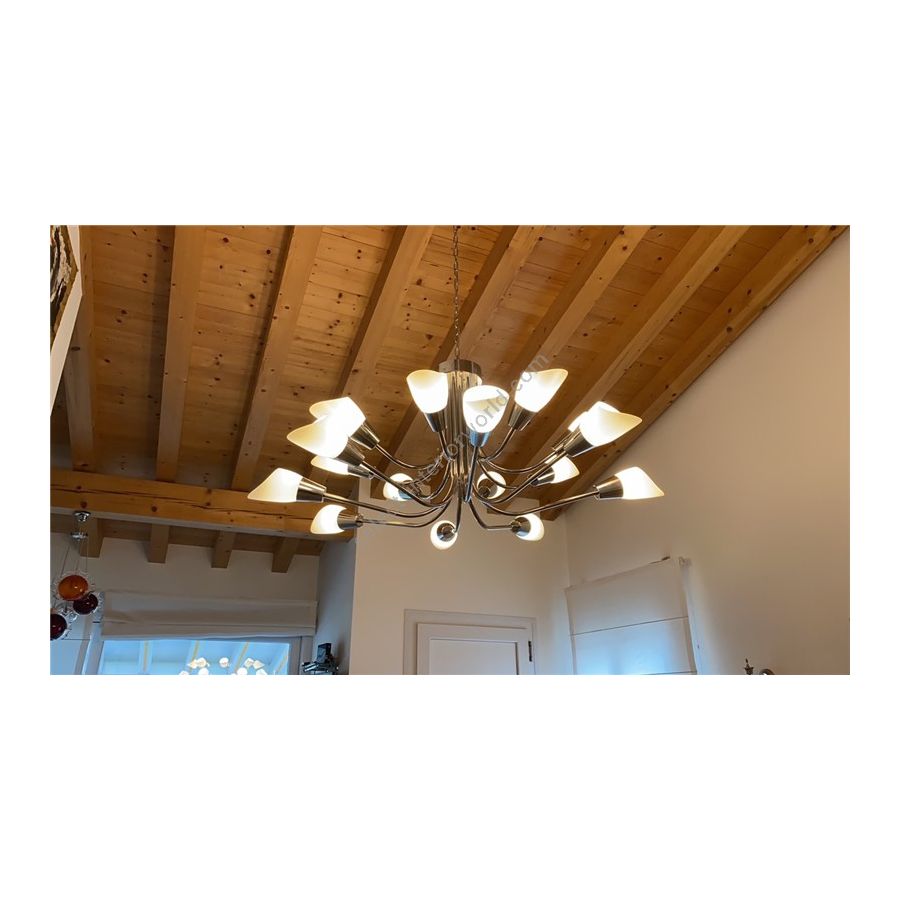 Chandelier with white crystal part. Lighting item that diffuses the light with great effect in the surrounding environement creating a warm and welcoming atmosphere.