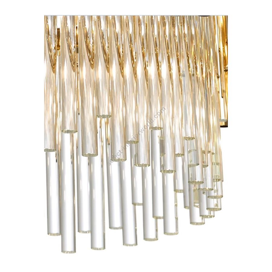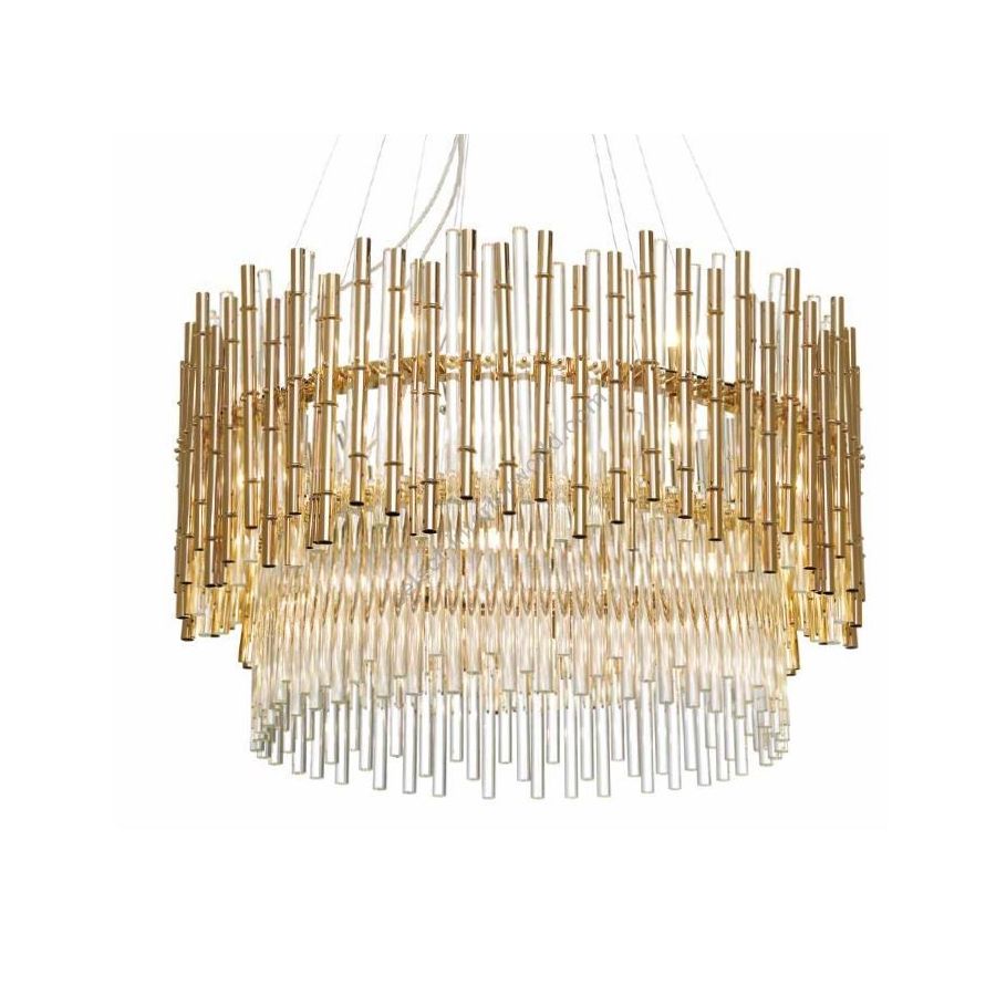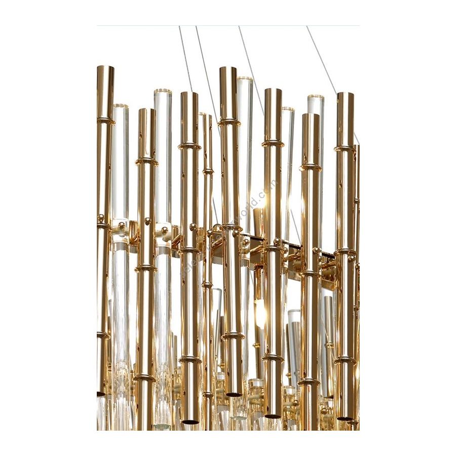 Chandelier in glass and brass elements in the shape of bamboo. Lighting item that diffuses the light with great effect in the surrounding environement creating a warm and welcoming atmosphere.