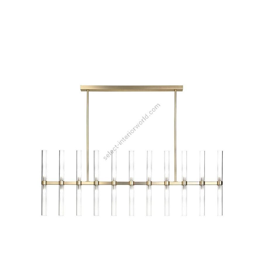 Rectangular chandelier with borosilicate glass tubes with double switch 11+11 bulbs. Structure in brushed soft gold finishing. Lighting item that diffuses the light with great effect in the surrounding environement creating a warm and welcoming atmosphere.