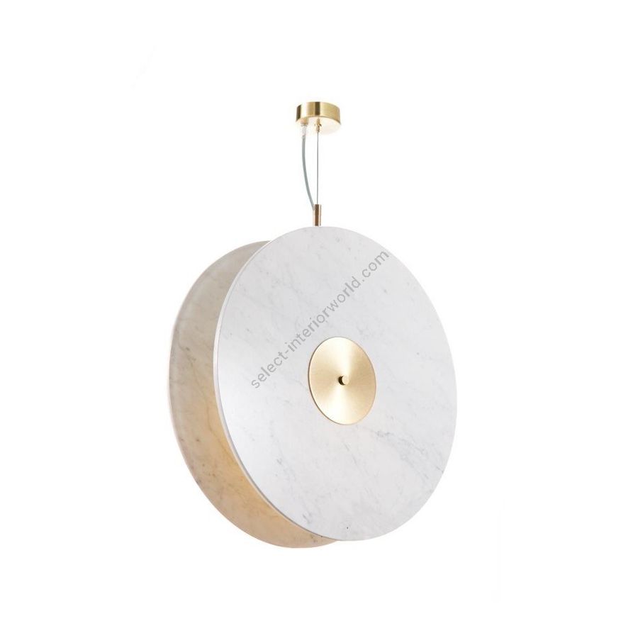 Chandelier with double marble disc. Lighting item that diffuses the light with great effect in the surrounding environement creating a warm and welcoming atmosphere.