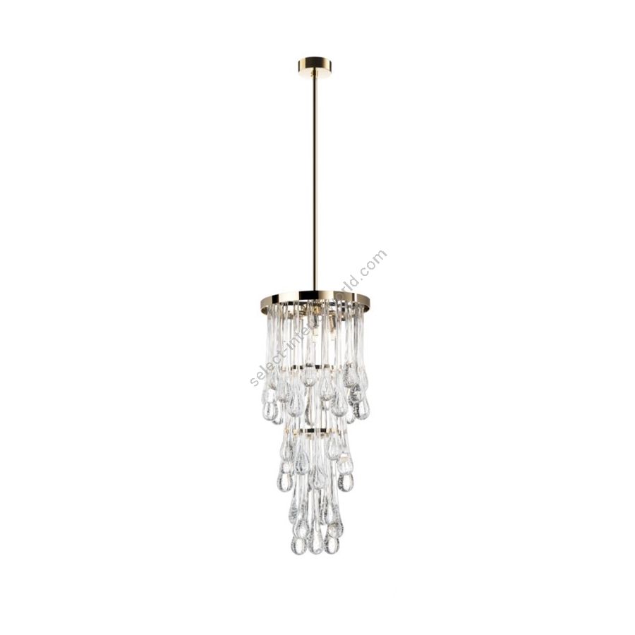 The chandelier features Murano glass droplets with a distinctive air bubble inside, and a pale gold metal finish. The rod can be customized upon request. This chandelier combines the traditional art of Murano glass with a modern and elegant touch. The glass droplets provide a delicate and diffused illumination, creating a charming and sophisticated atmosphere. The pale gold metal finish adds a touch of luxury and refinement.