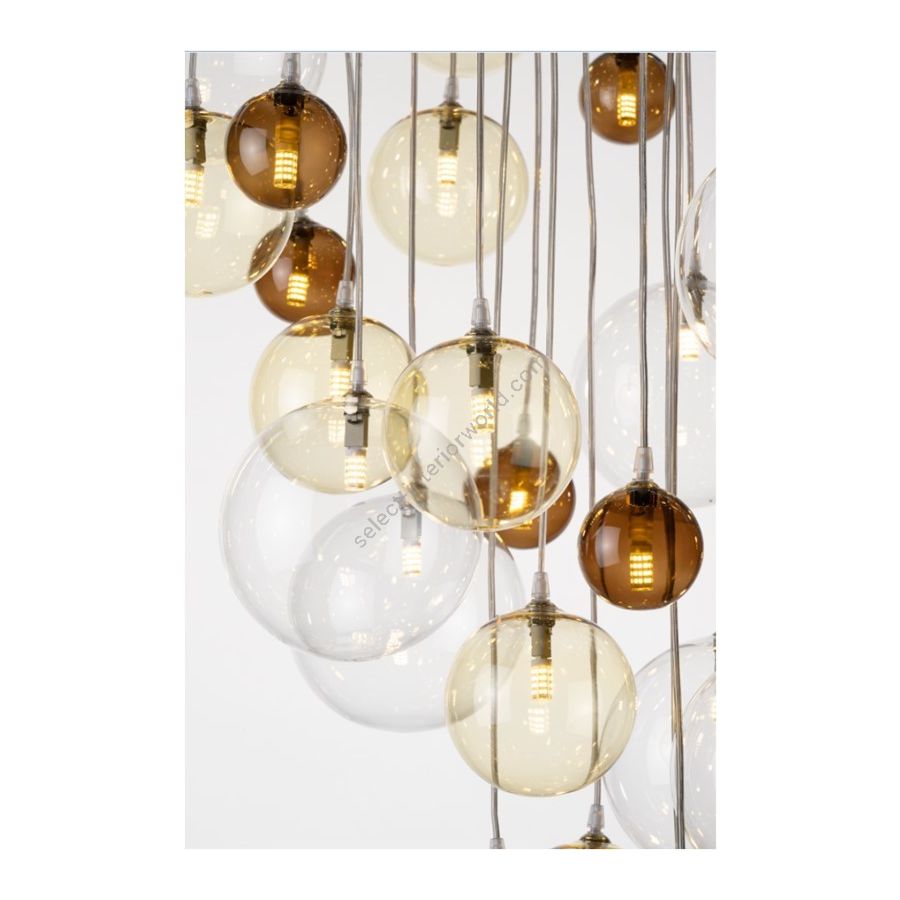 The modern cascading chandelier with multicolored blown glass spheres is a stunning and decorative addition to any space, especially youth-oriented and spacious environments. The multicolored blown glass spheres create a lively and playful effect, diffusing a soft and enchanting light. Their unique design captures the gaze and adds a touch of originality to the surrounding environment.