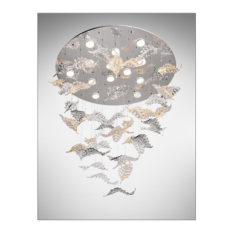 Leaf Murano Glass Chandelier is an elegant fusion of tradition and modernity. Transparent, gold, and gray Murano leaves float delicately, adding a touch of sophistication. The metal plate with a mirror-effect stainless steel reflector creates a stylish base, reflecting the beauty of the leaves and amplifying the brightness. In short, a chandelier that combines class and style in a captivating design.