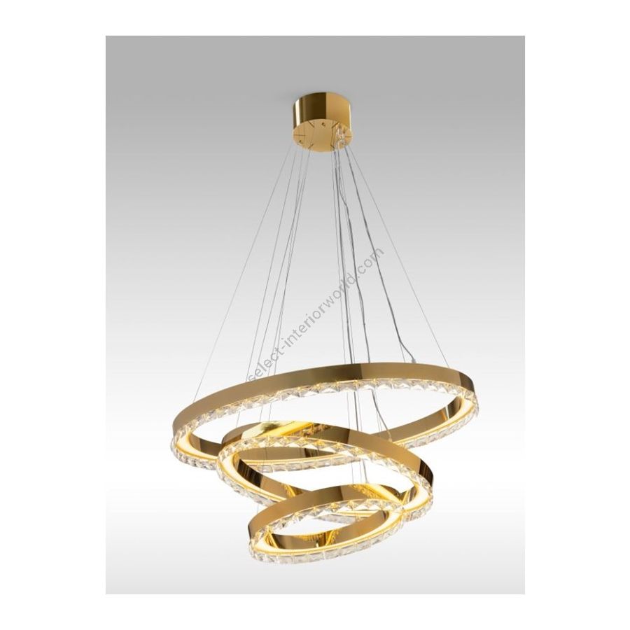 Galaxy Rings with Crystal – Chandelier Galaxy Rings with Crystal is a striking contemporary chandelier composed of circular metal rings with a 24K gold finish, enhanced by Asfour crystals that create extraordinary reflections and sparkling light effects. The rings can be adjusted in height through steel suspension cables, allowing you to design your own custom installation and achieve a dynamic, architectural composition. The pre-installed LED strips emit a soft downward light, providing comfortable, diffused illumination without glare. Available in other finishes upon request, to perfectly complement various interior styles. Dimensions: Maximum diameter Ø 100 cm (˜ 39.4”) Height 50 cm (˜ 19.7”) – adjustable steel cable (100 cm / 39.4”) Weight 35 kg (˜ 77.2 lb) A true statement piece, ideal for modern interiors, dining areas, living rooms, and representative spaces, where elegance and brilliance merge in perfect harmony.