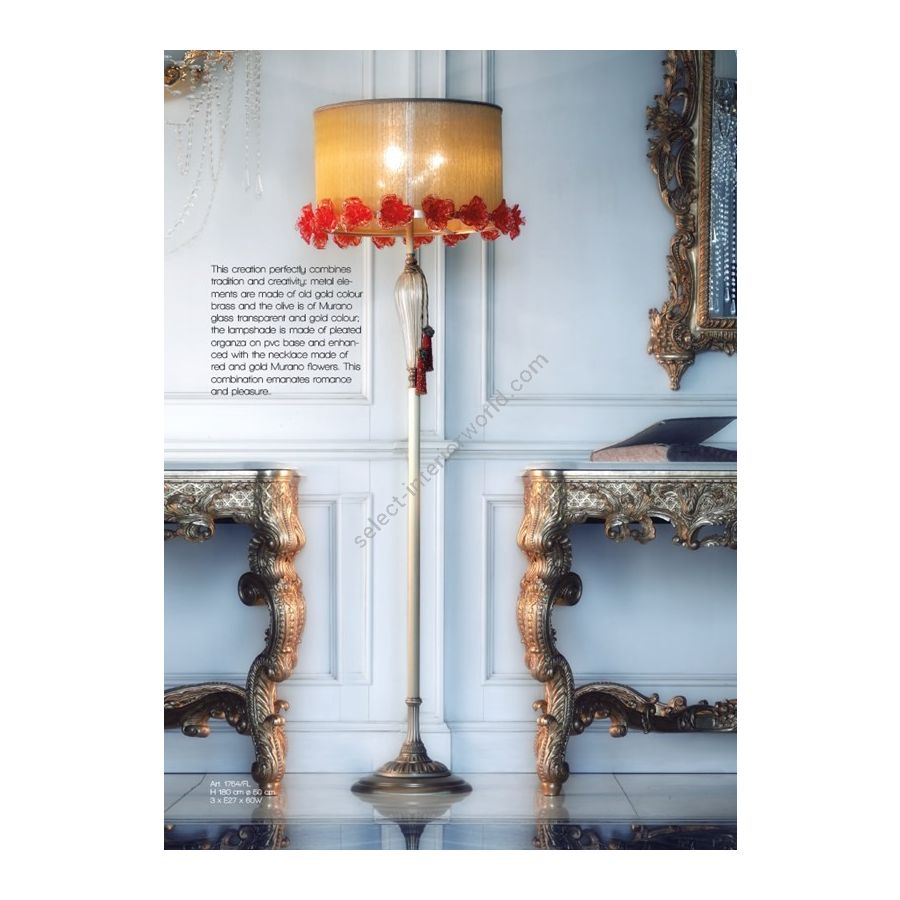 This floor lamp is a composition of brass and Murano glass decorated with organza lampshade edged by hand-made glass flowers. Lighting item that diffuses the light with great effect in the surrounding environement creating a warm and welcoming atmosphere.
