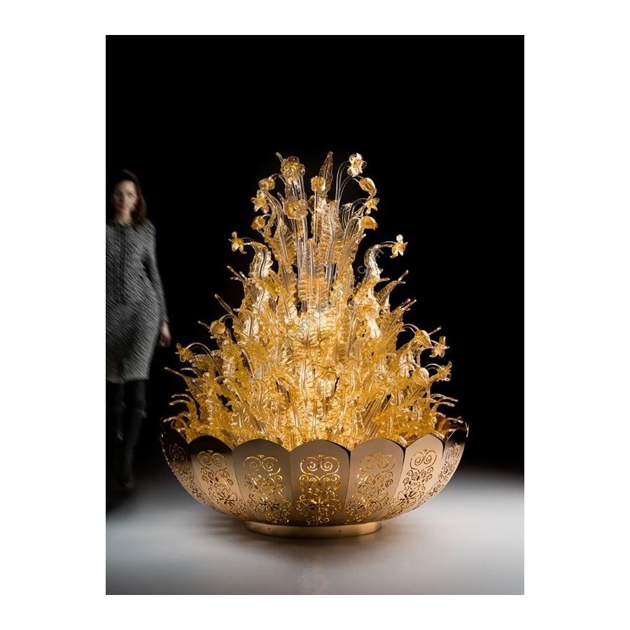 Spectacular and giant floor lamp suitable for entrance or center room covered with perforated metal bowl with 24k gold bath and blown Murano glass with 24K gold decoration. Lighting item that diffuses the light with great effect in the surrounding environement creating a warm and welcoming atmosphere.