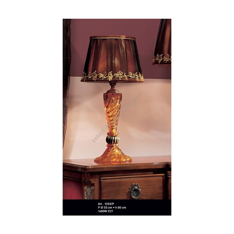 Lamp in amber Murano glass with brown silk lampshade and gold trimmings. Lighting fixture that diffuses the light into the surrounding environment with great effect, creating a warm and welcoming atmosphere.