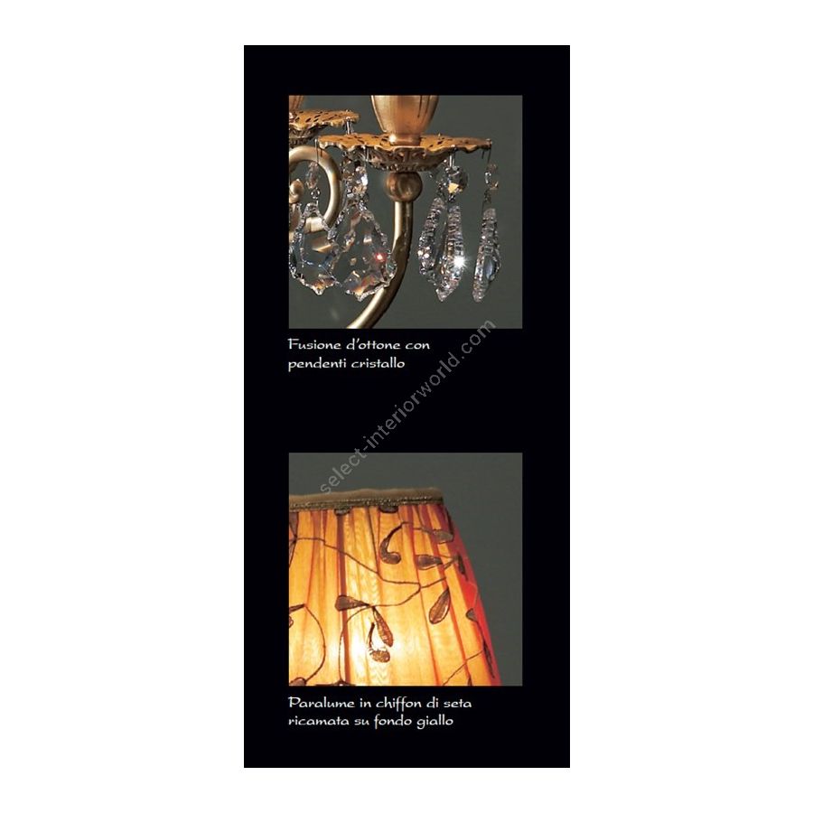 Flambo' lamp in old gold brass with 4 lights, conical lampshades. Lighting fixture that diffuses the light into the surrounding environment with great effect, creating a warm and welcoming atmosphere.