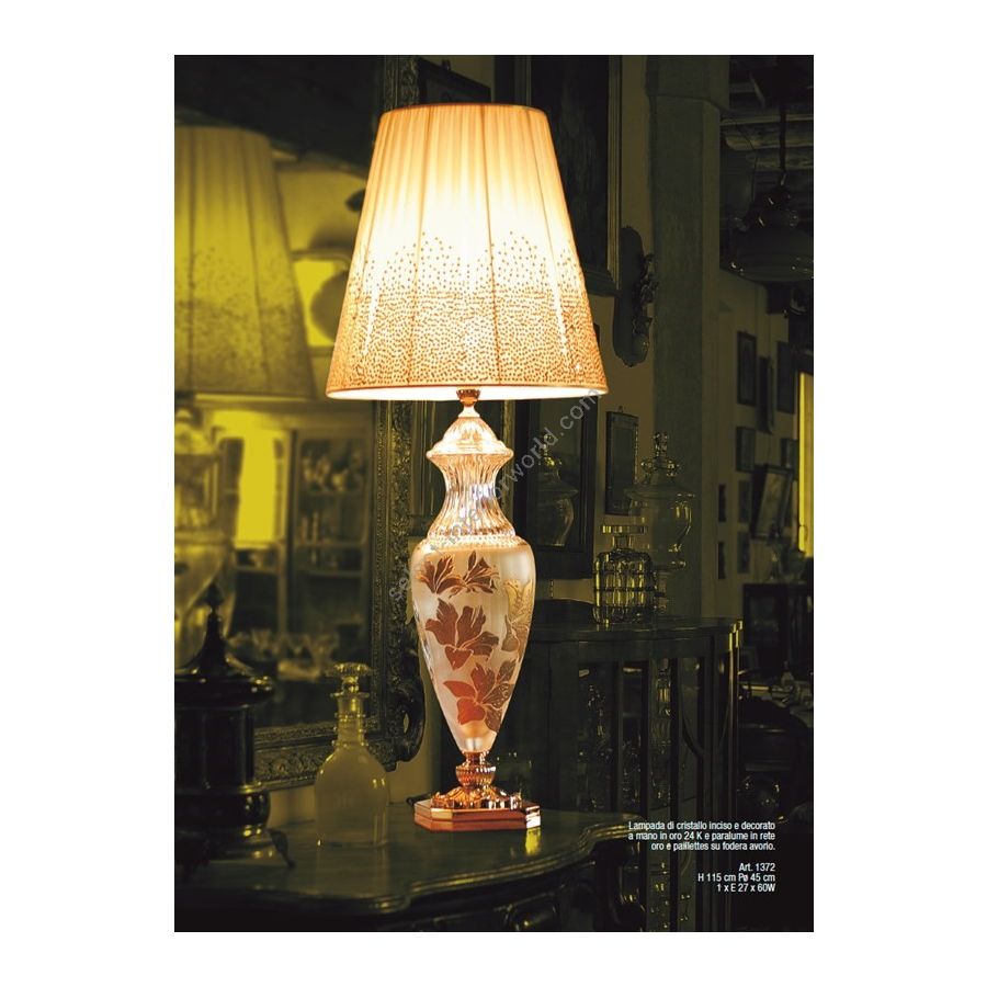Table Lamp in Florentine crystal engraved and decorated by hand in Gold 24K with lamphshade in golden net & pailletes. Lighting item that diffuses the light with great effect in the surrounding environement creating a warm and welcoming atmosphere.