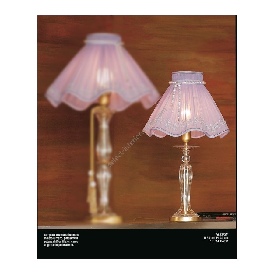 Table lamp in clear crystal with lampshade in lillac chiffon with river pearls decoration. Lighting item that diffuses the light with great effect in the surrounding environement creating a warm and welcoming atmosphere.