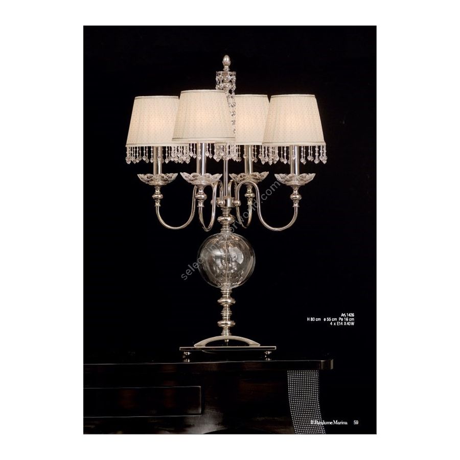 Table lamp with Florentine crystal elements and fabric lampshades. Lighting item that diffuses the light with great effect in the surrounding environement creating a warm and welcoming atmosphere.