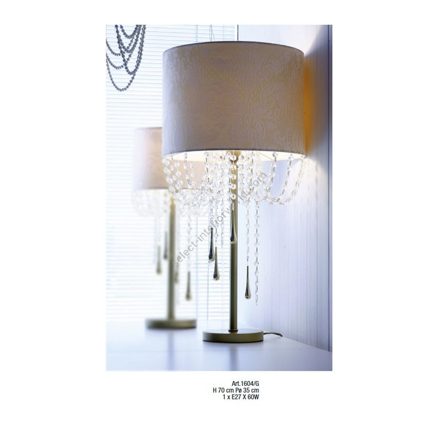 Table lamp with lampshade with Asfour and Murano gold Drops. Lighting item that diffuses the light with great effect in the surrounding environement creating a warm and welcoming atmosphere.