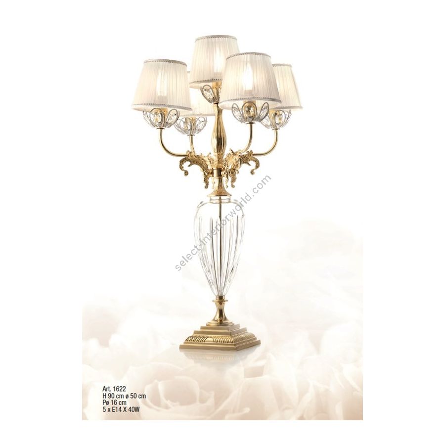 Table Lamp 5 lights in cast brass with crystal cups and double layer lampshades. Lighting item that diffuses the light with great effect in the surrounding environement creating a warm and welcoming atmosphere.