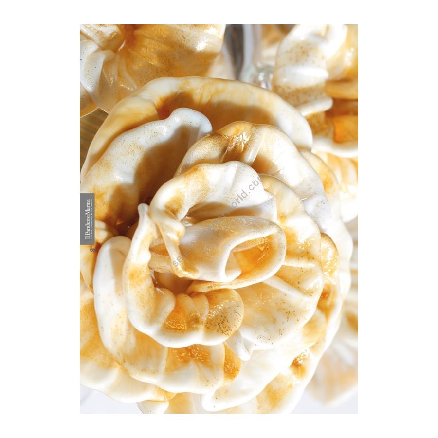 Table lamp with Murano glass yellow flowers and colorful beads. Lighting item that diffuses the light with great effect in the surrounding environement creating a warm and welcoming atmosphere.