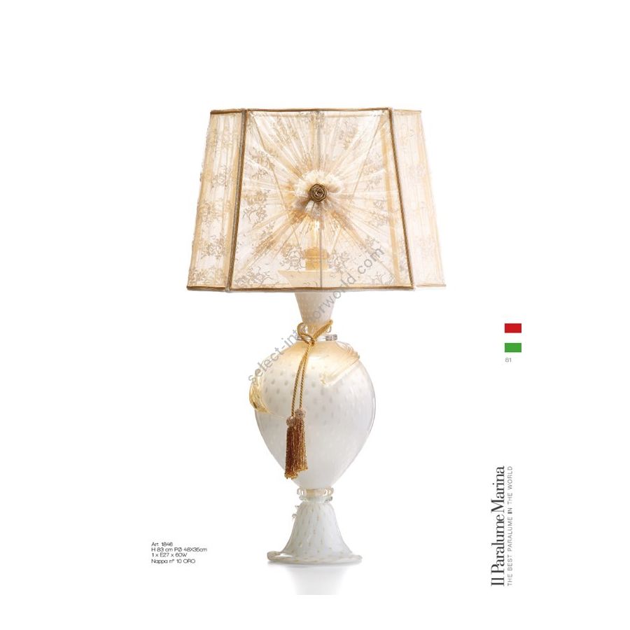 Murano Glass table Lamp in White and gold. Hand-Made fabric lampshade in lace. Tassel is not included in the price. Lighting item that diffuses the light with great effect in the surrounding environement creating a warm and welcoming atmosphere.
