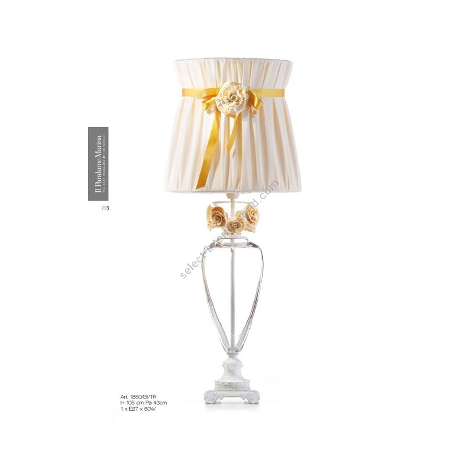 Table lamp in Florentine crystal and cast brass. Decorated with yellow Murano glass flowers and lampshade in double fabric with silk ribbon and glass flower. Lighting item that diffuses the light with great effect in the surrounding environement creating a warm and welcoming atmosphere.