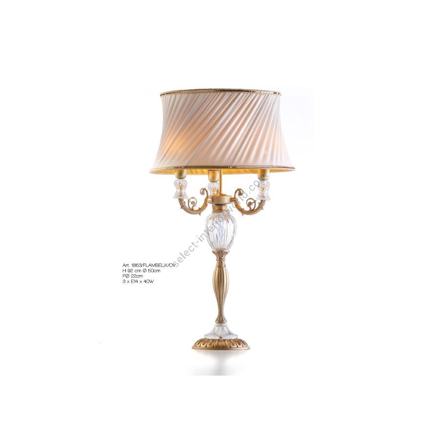 Table lamp in cast brass and Florentine crystal inserts. The lampshade is made in double layer fabric with a sophisticated technique. Lighting item that diffuses the light with great effect in the surrounding environement creating a warm and welcoming atmosphere.