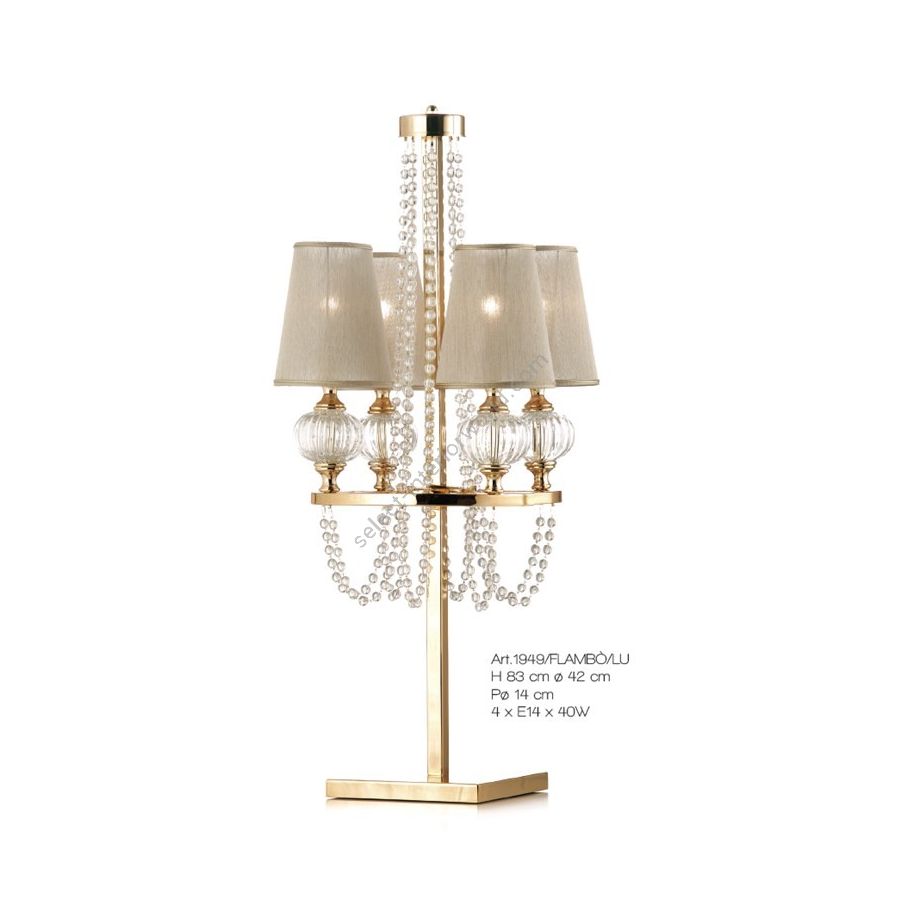 Flambeaux table lamp with Murano glass beads. Lighting item that diffuses the light with great effect in the surrounding environement creating a warm and welcoming atmosphere.