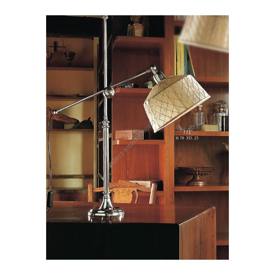 Nickel stylo lamp with joint, conical lampshade. Lighting fixture that diffuses the light into the surrounding environment with great effect, creating a warm and welcoming atmosphere.