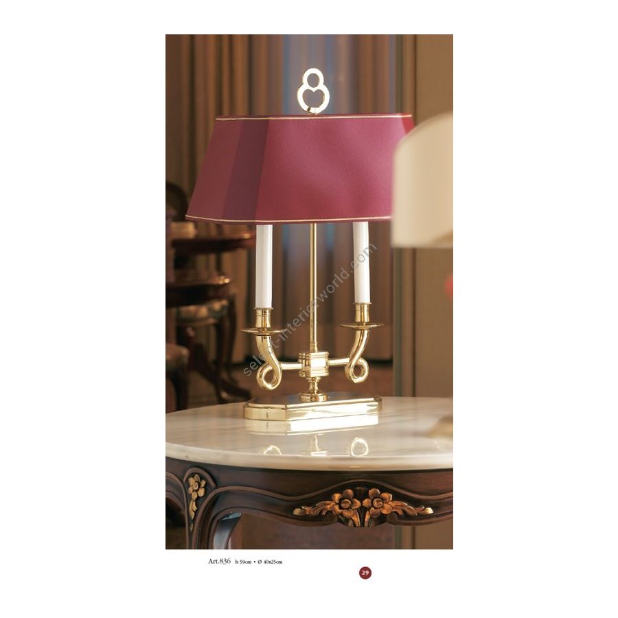 Table lamp in brass with bordeaux lampshade. Lighting item that diffuses the light with great effect in the surrounding environement creating a warm and welcoming atmosphere.