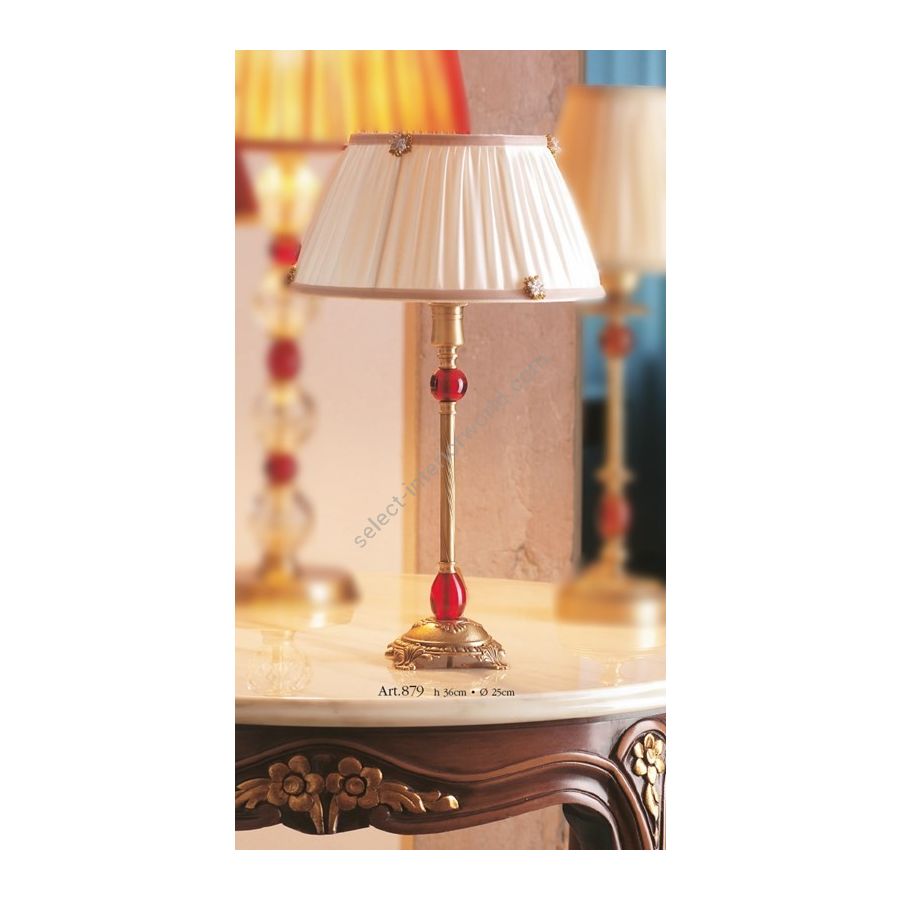Table lamp in brass with red inserts and fabric lampshade. Lighting item that diffuses the light with great effect in the surrounding environement creating a warm and welcoming atmosphere.