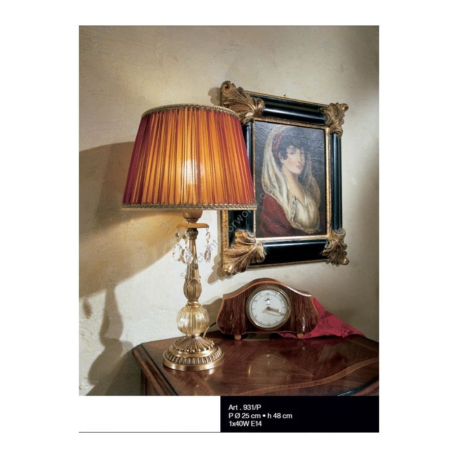 Table lamp in brass with Murano glass ball and crystal pendants. Lighting item that diffuses the light with great effect in the surrounding environement creating a warm and welcoming atmosphere.