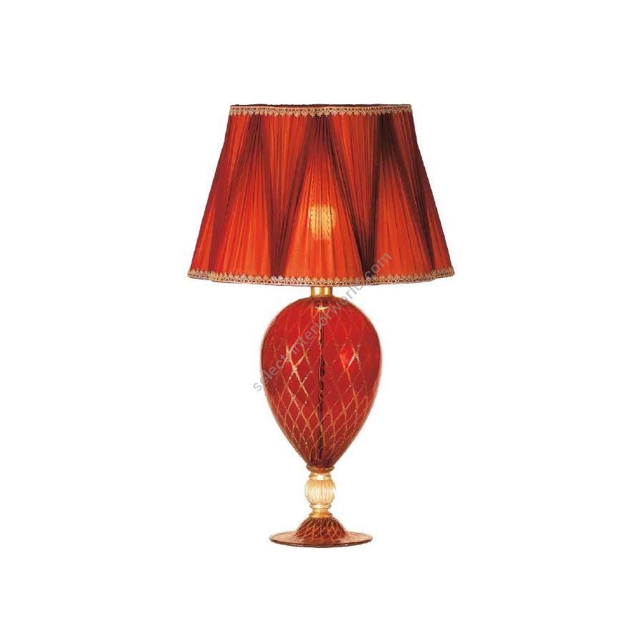 Traditional Venetian glass table lamp in red with gold powder net. Lighting item that diffuses the light with great effect in the surrounding environement creating a warm and welcoming atmosphere.