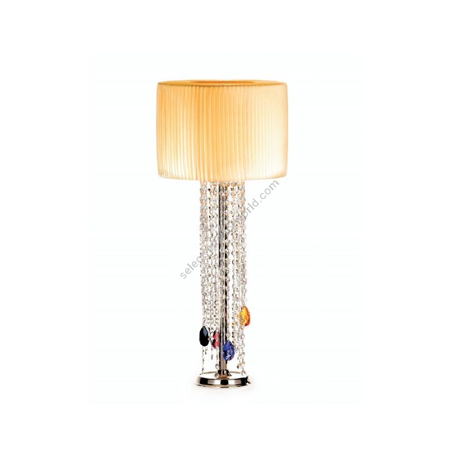 Table lamp with cylindrical lampshade and crystal pendants. Lighting item that diffuses the light with great effect in the surrounding environement creating a warm and welcoming atmosphere.