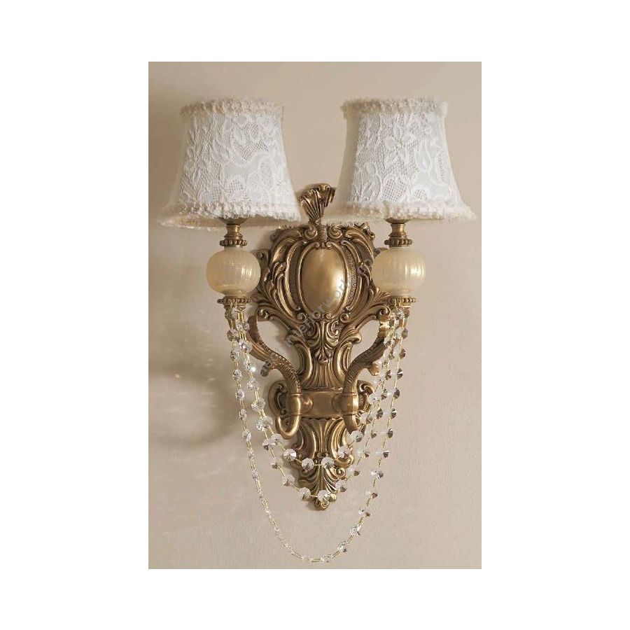 Wall sconce 2 lights in cast brass with elements in Murano glass and Asfour crystals. Lighting item that diffuses the light with great effect in the surrounding environement creating a warm and welcoming atmosphere.