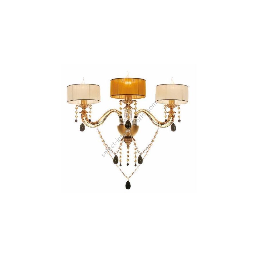 3 lights applique with glass arms and pierced cups, amber crystal Swarovski® pendants. Lighting fixture that diffuses the light into the surrounding environment with great effect, creating a warm and welcoming atmosphere.
