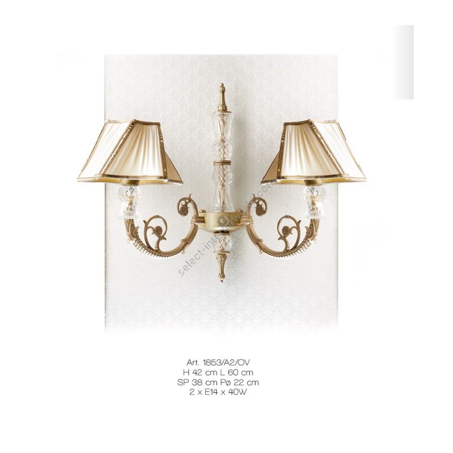 2 lights wall lamp in cast brass and Florentine crystal inserts. The lampshades are made in double layer fabric with a sophisticated technique. Lighting item that diffuses the light with great effect in the surrounding environement creating a warm and welcoming atmosphere.