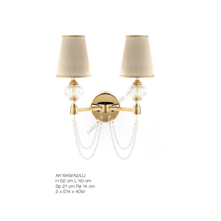 2 lights wall lamp with Murano glass beads. Lighting item that diffuses the light with great effect in the surrounding environement creating a warm and welcoming atmosphere.