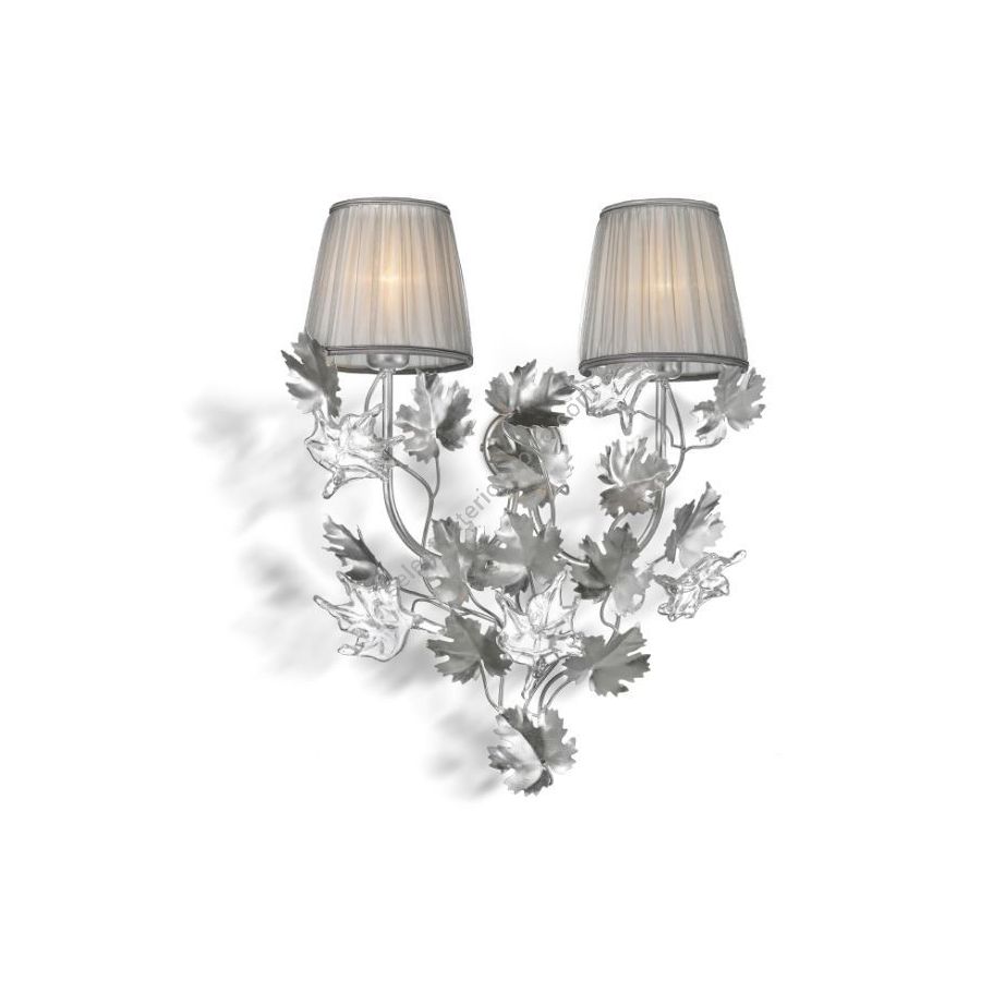 Elegant wall lamp with a harmonic line, Silver metal paint with decorative leaves in transparent glass. Lighting item that diffuses the light with great effect in the surrounding environement creating a warm and welcoming atmosphere.