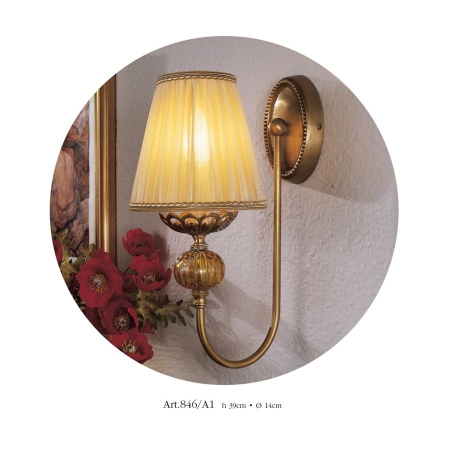 Wall lamp 1 light in brass with insert of amber Murano glass and fabric lampshade. Lighting item that diffuses the light with great effect in the surrounding environement creating a warm and welcoming atmosphere.