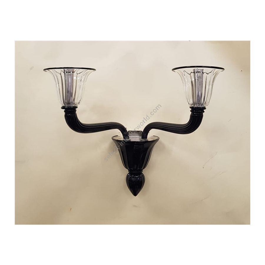 Murano glass wall lamp 2 lights in black and clear colors. Lighting item that diffuses the light with great effect in the surrounding environement creating a warm and welcoming atmosphere.